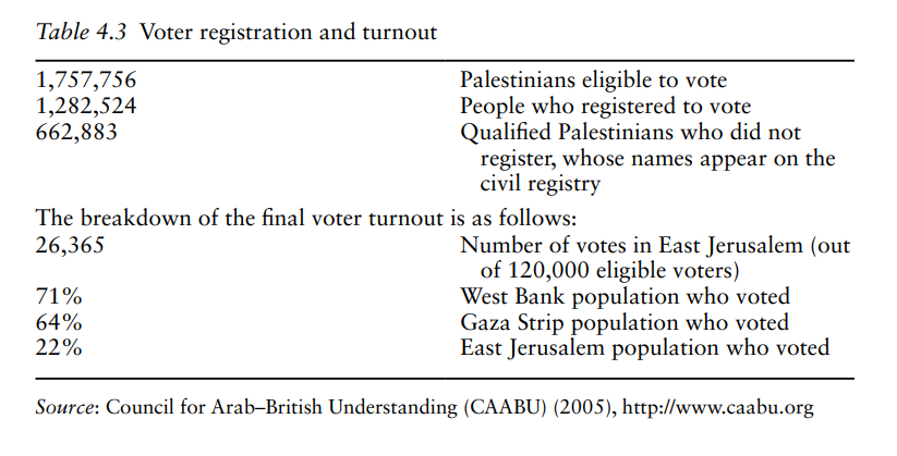 파타의 요구로, 6천명 동예루살렘 거주 팔레스타인은 투표가 가능했음. 그리고 나머지 10만명의 경우, 다른 투표장까지 가서 투표할 수 있게끔 했다.