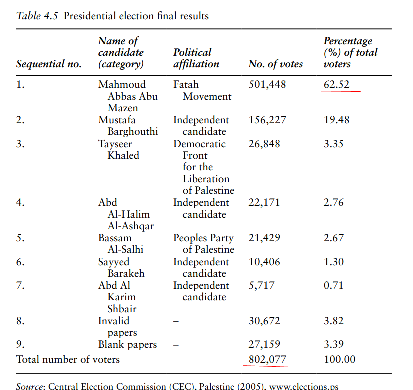 7명 주요 후보들 중, 파타 후보 압바스가 62.5%로 1위, 독립 후보 무스타파 바르구티(Mustafa Barghouti)가 19.48%로 2위로, 압바스가 쉽게 당선되었다. 무스타파 바르구티는 2007년 통일정부에서 정보부 장관이 되었다.