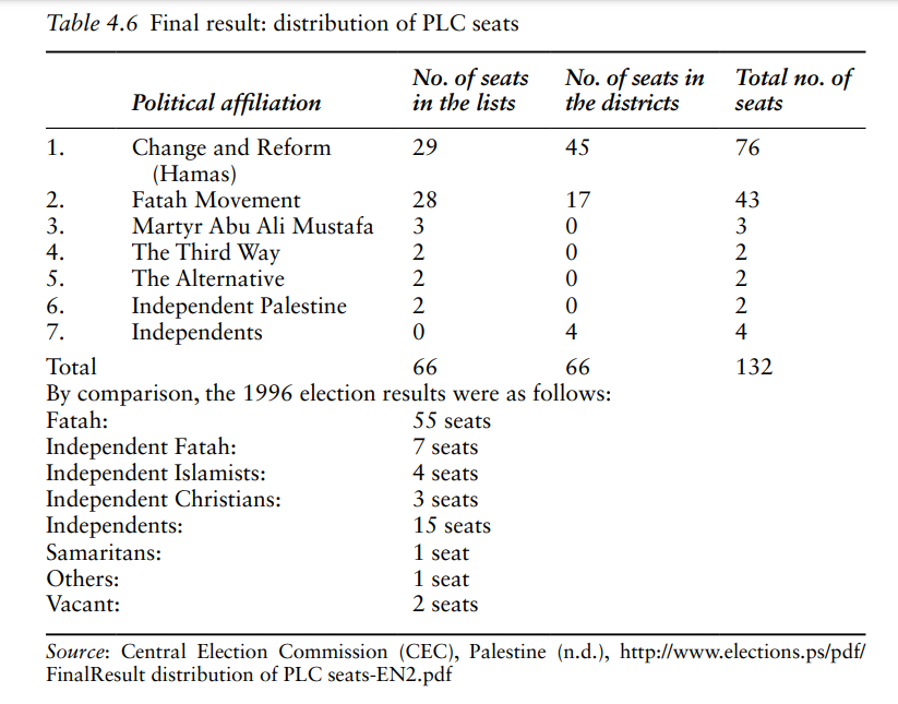 1996년 최초 대선에서 아라파트가 88.2%를 얻어 압도적인 1위로 당선된 것과 2006년 대선을 비교하면, 지난 10년 사이 팔레스타인 내부에 많은 정당들이 생겨나게 되었음을 알 수 있다.