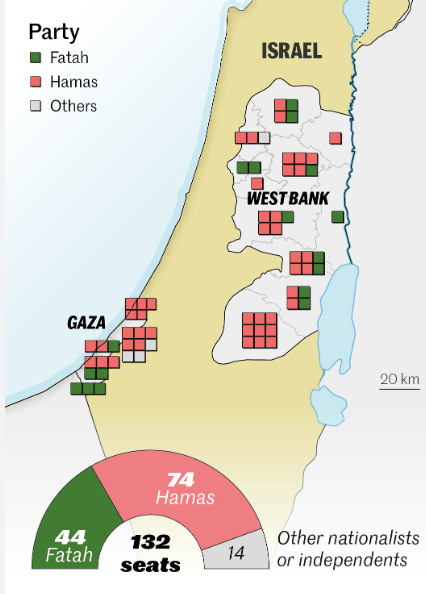 하마스는 132석 중 76석을 차지했고, 줄곧 집권당이었던 파타는 43석 획득에 그쳤다.
