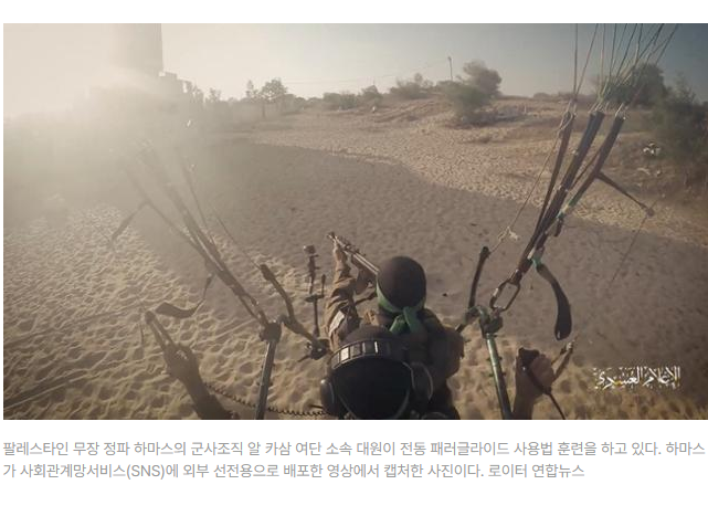 팔레스타인 무장 정파 하마스의 군사조직 알 카삼 여단 소속 대원이 전동 패러글라이드 사용법 훈련을 하고 있다. 하마스가 사회관계망서비스(SNS)에 외부 선전용으로 배포한 영상에서 캡처한 사진이다. 로이터 연합뉴스