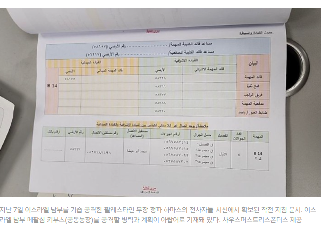 지난 7일 이스라엘 남부를 기습 공격한 팔레스타인 무장 정파 하마스의 전사자들 시신에서 확보된 작전 지침 문서. 이스라엘 남부 메팔심 키부츠(공동농장)를 공격할 병력과 계획이 아랍어로 기재돼 있다. 사우스퍼스트리스폰더스 제공