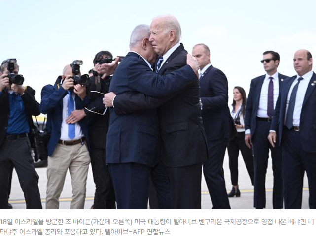 18일(현지시간) 이스라엘 텔아비브의 공항에 도착한 바이든 대통령의 ‘첫 행동’은 활주로에 영접 나온 네타냐후 총리와의 포옹이었다. 전날 하마스 본거지인 가자지구 내 병원 폭발 참사와 관련, 아랍 국가들의 이스라엘 비난 분위기는 고려하지 않고 맹방의 책임을 면제해 주는 것으로도 보였다. 이스라엘 방문 후 예정돼 있던 팔레스타인 자치정부, 이집트, 요르단 정상과의 4자 회담이 무산됐는데도 가자지구 지상군 투입을 고려 중인 이스라엘을 재차 응원한 셈이었다.