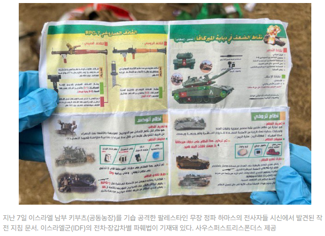 전술 가이드라인 책자도 있었다. 이스라엘군 탱크와 장갑차 8종의 사진이 담긴 문서엔 "IDF 주력전차 ‘메르카바’는 RPG-7 등을 사용해 50m 거리에서 사격해야 한다” 등 차량별 세부 공략도 기재됐다. WSJ는 “일부 무장대원이 강력한 IDF 군대와 맞선 경험이 거의 없었다는 걸 암시한다”고 해석했다.