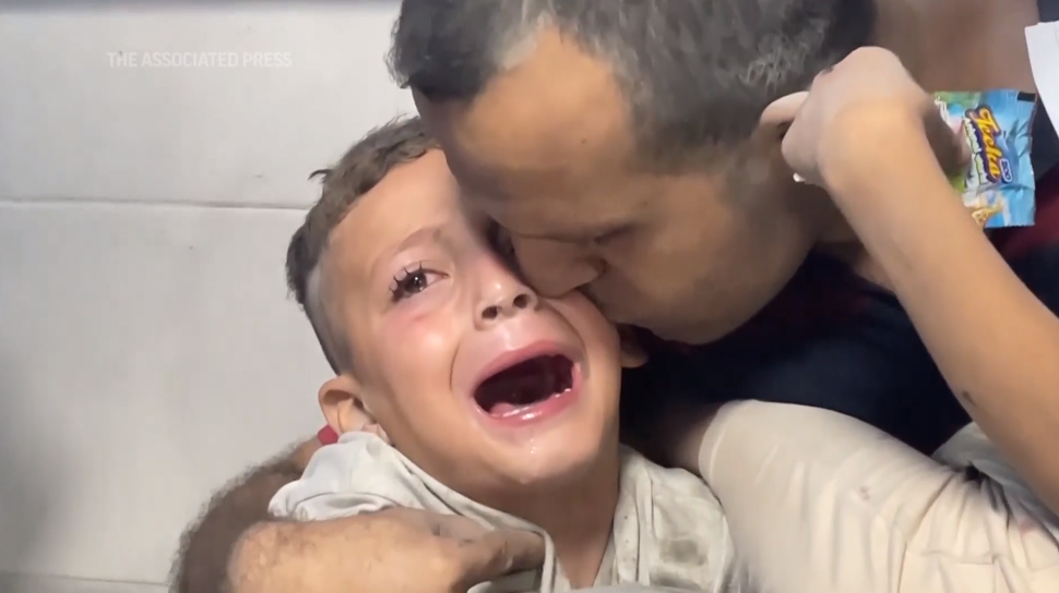 A father also knelt on the floor of the Al-Aqsa Hospital in Deir Al-Balah next to the bodies of three dead children cocooned in bloodied sheets with their faces showing.