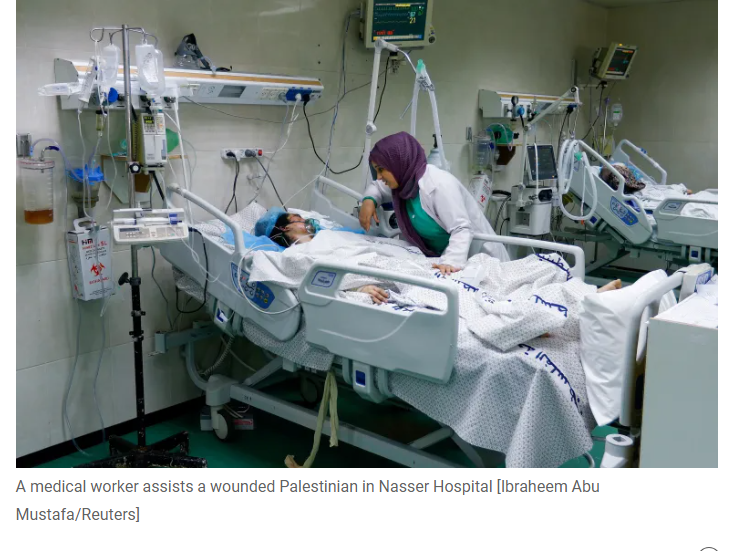 A medical worker assists a wounded Palestinian in Nasser Hospital [Ibraheem Abu Mustafa/Reuters]