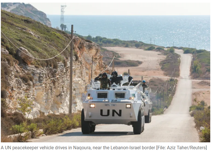 A UN peacekeeper vehicle drives in Naqoura, near the Lebanon-Israel border [File: Aziz Taher/Reuters]