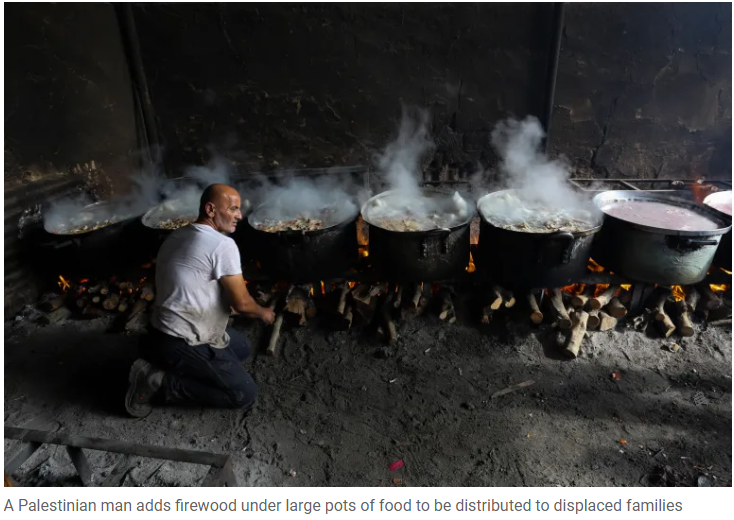 A Palestinian man adds firewood under large pots of food to be distributed to displaced families [Hatem Ali/AP Photo]
