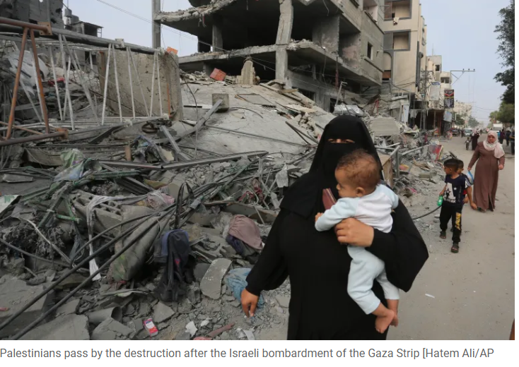 Palestinians pass by the destruction after the Israeli bombardment of the Gaza Strip [Hatem Ali/AP Photo]