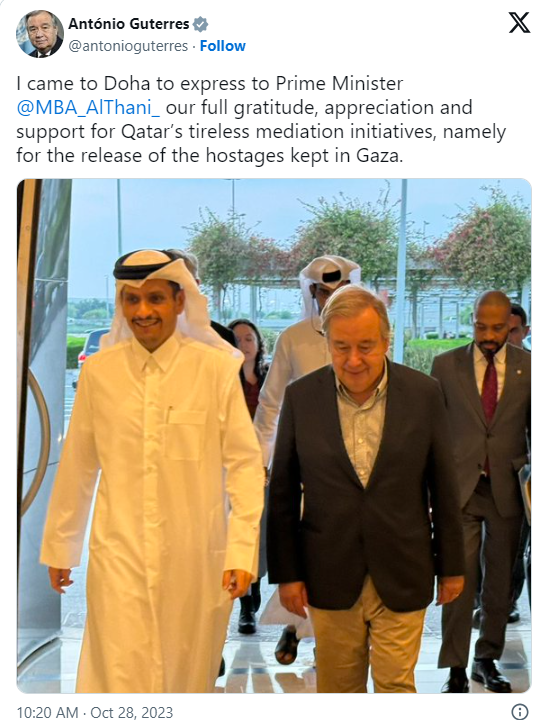 Guterres came to express “our full gratitude, appreciation and support for Qatar’s tireless mediation initiatives, namely for the release of the hostages kept in Gaza”.