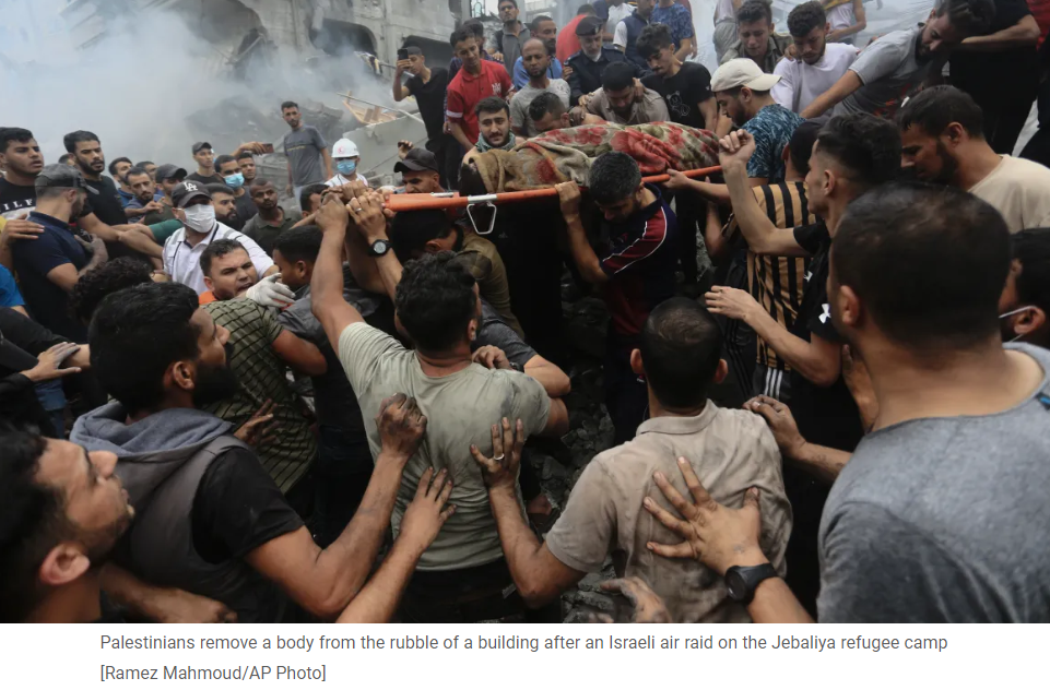 Palestinians remove a body from the rubble of a building after an Israeli air raid on the Jebaliya refugee camp [Ramez Mahmoud/AP Photo]