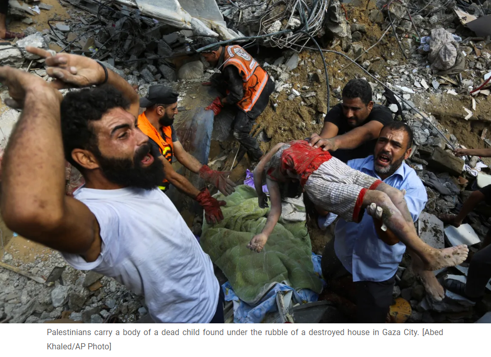 Palestinians carry a body of a dead child found under the rubble of a destroyed house in Gaza City. [Abed Khaled/AP Photo]