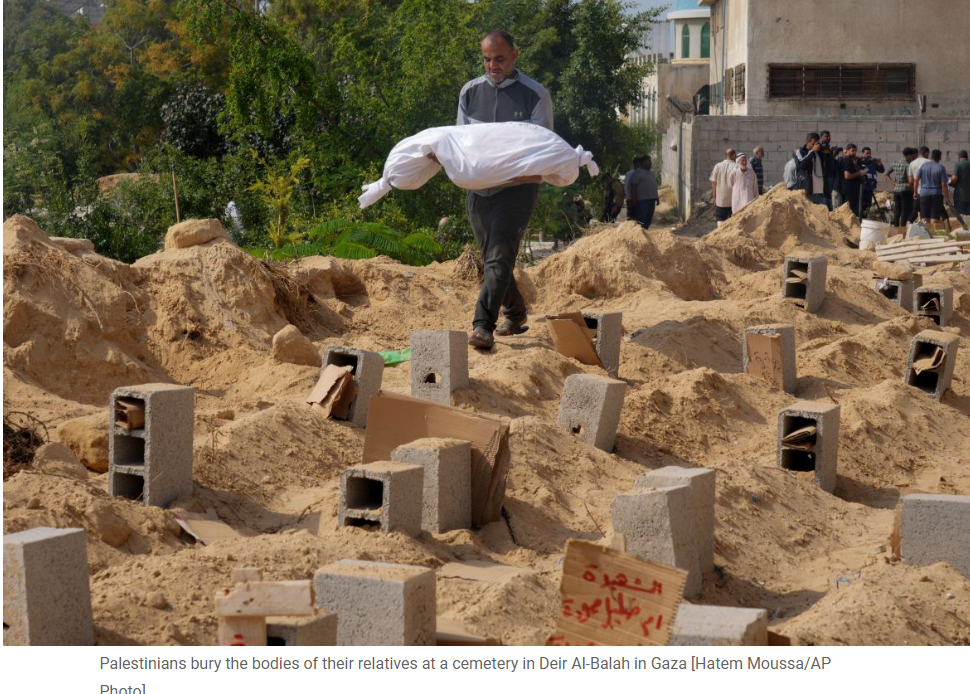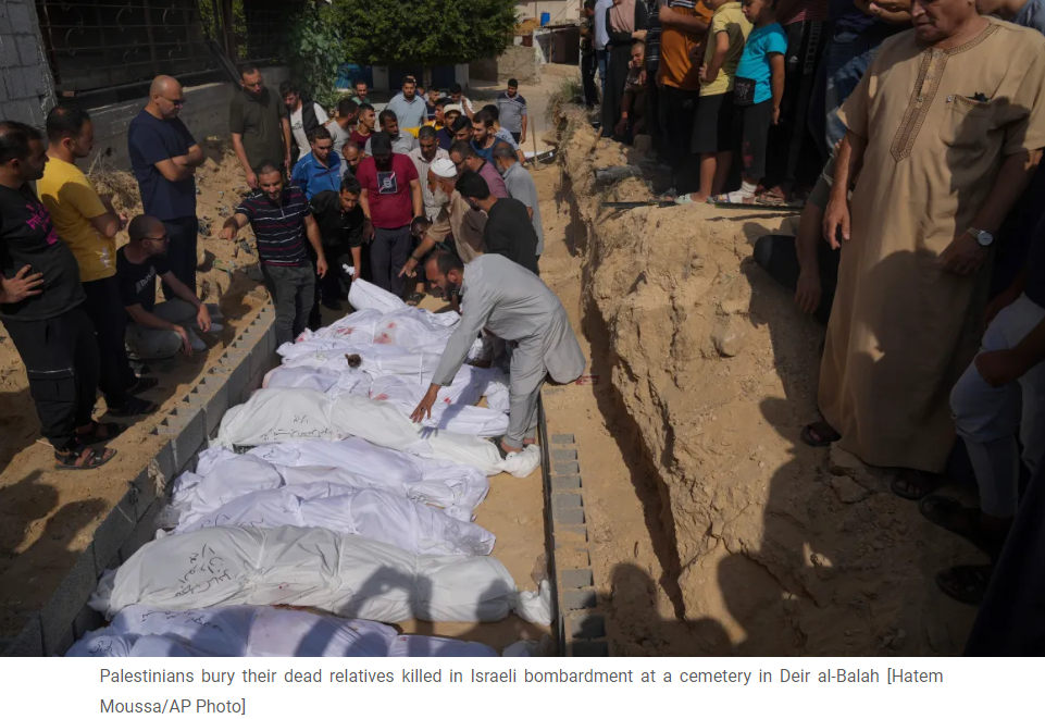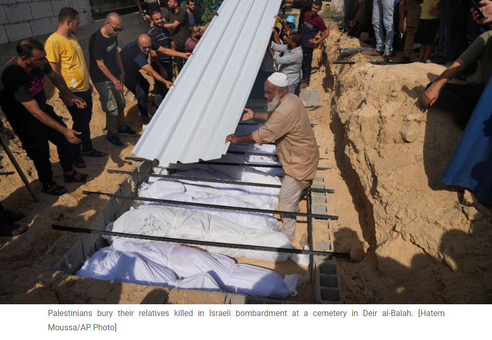 Palestinians bury their dead relatives killed in Israeli bombardment at a cemetery in Deir al-Balah [Hatem Moussa/AP Photo]