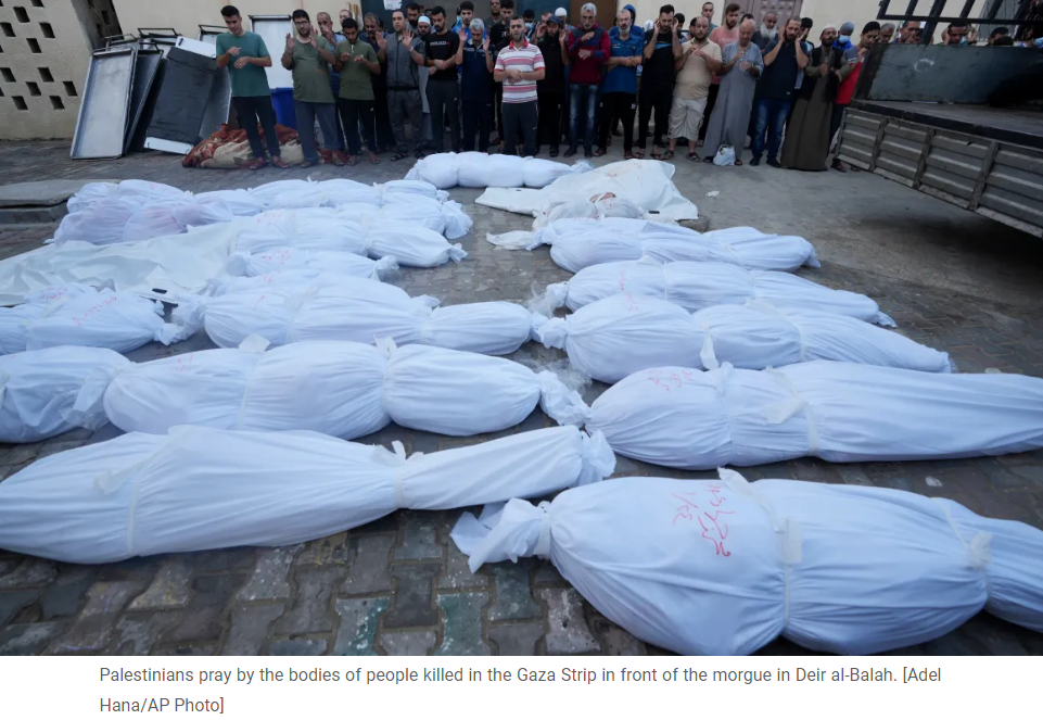 Palestinians pray by the bodies of people killed in the Gaza Strip in front of the morgue in Deir al-Balah. [Adel Hana/AP Photo]
