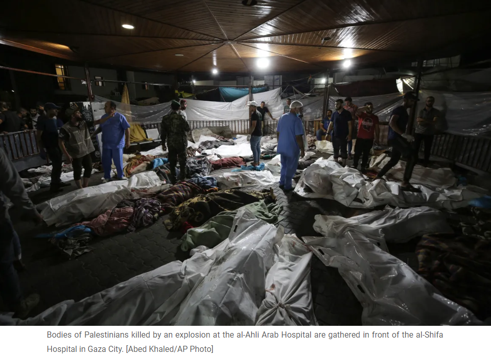 Bodies of Palestinians killed by an explosion at the al-Ahli Arab Hospital are gathered in front of the al-Shifa Hospital in Gaza City. [Abed Khaled/AP Photo]
