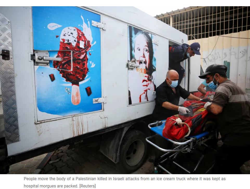 People move the body of a Palestinian killed in Israeli attacks from an ice cream truck where it was kept as hospital morgues are packed. [Reuters]