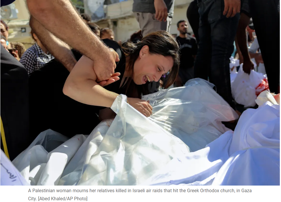 A Palestinian woman mourns her relatives killed in Israeli air raids that hit the Greek Orthodox church, in Gaza City. [Abed Khaled/AP Photo]