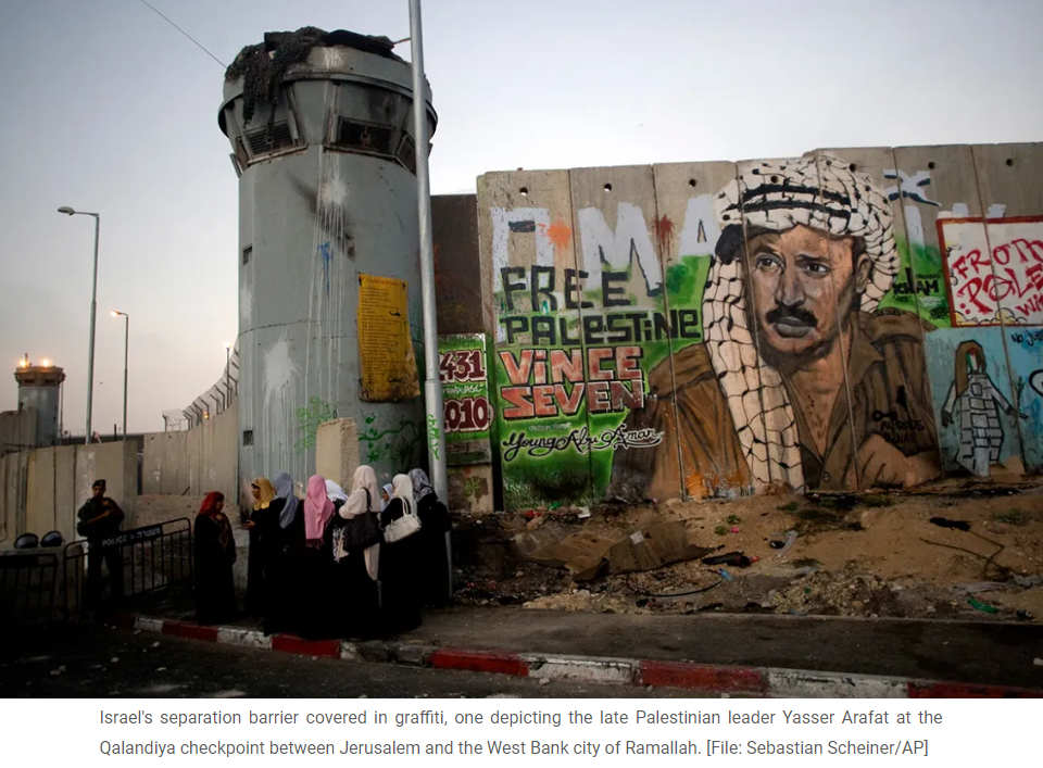 Israel's separation barrier covered in graffiti, one depicting the late Palestinian leader Yasser Arafat at the Qalandiya checkpoint between Jerusalem and the West Bank city of Ramallah. [File: Sebastian Scheiner/AP]