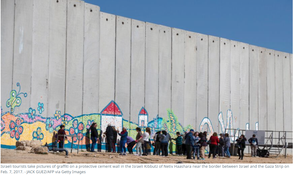 Israeli tourists take pictures of graffiti on a protective cement wall in the Israeli Kibbutz of Netiv Haashara near the border between Israel and the Gaza Strip on Feb. 7, 2017. - JACK GUEZ/AFP via Getty Images