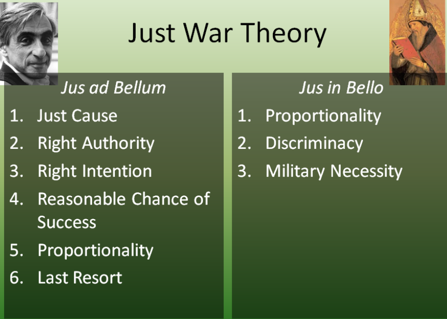 1. 정의로운 참전 (정당한 참전) 2. 정의로운 전투행위(전투행위가 갖춰야 할 조건들) 3. 정의로운 전쟁 종식