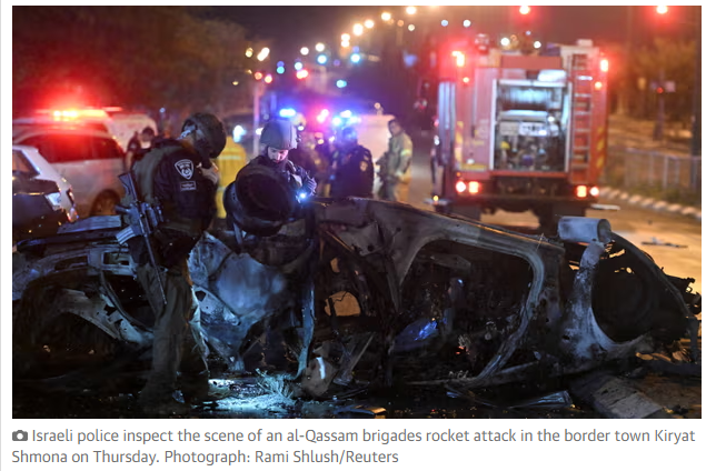 Hamas’s armed wing, the al-Qassam brigades, said its fighters in southern Lebanon were behind the shelling of the northern Israeli town of Kiryat Shmona, where four rockets landed in an industrial area, injuring two people and damaging buildings.