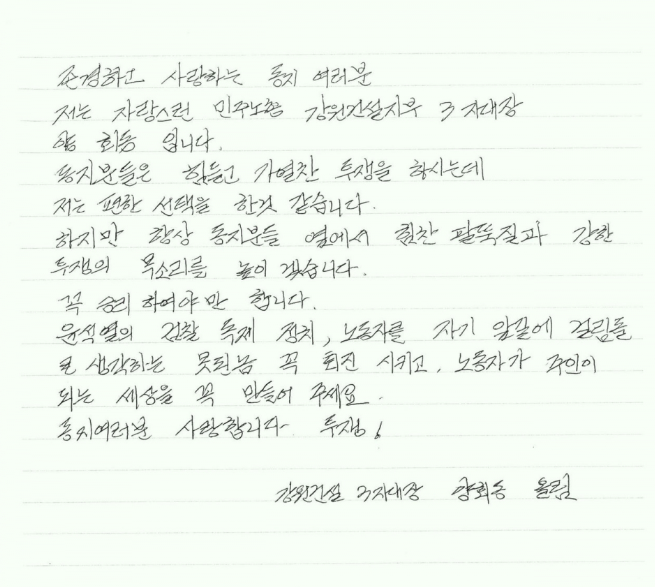 양회동 지대장이 노조 조합원들에게 남긴 유서.