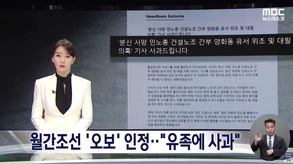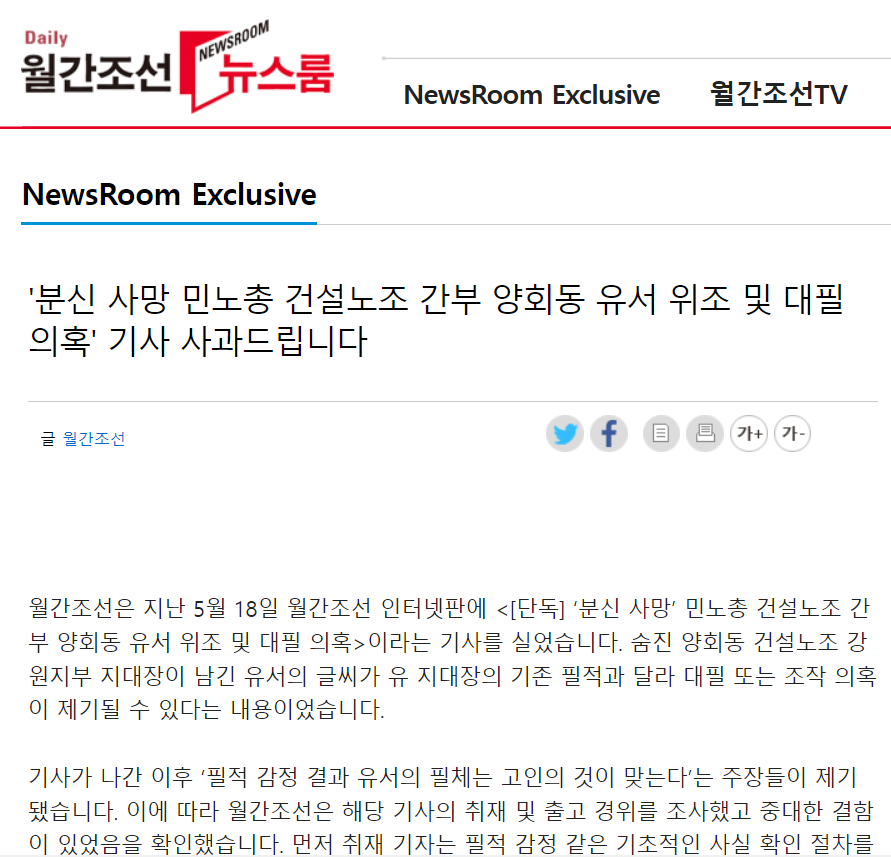 '분신 사망 민노총 건설노조 간부 양회동 유서 위조 및 대필 의혹' 기사 사과드립니다
