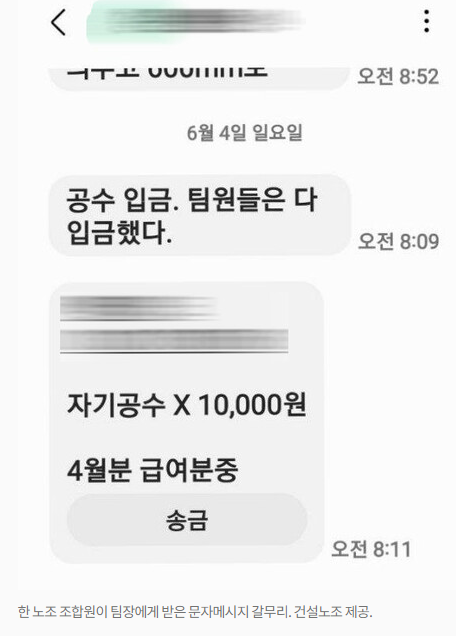 팀장은 그 금액에서도 매일 1만원씩을 소개비와 밥값 명목으로 가져갔다. 노동자 처지에선 일당이 25만원에서 23만원으로 2만원이나 줄어든 셈이다. 팀장은 수개월에 한 번씩 ‘회사 워크숍비’ 명목으로 조합원들에게 3만원씩을 따로 걷기도 했다. 현장 노동자들은 안 가고 회사 관리자들끼리만 가는 워크숍이다. 이에 대해 하청업체 쪽은 “팀장이 자재 구매 목적으로 걷었다고 한다. 현재 노동부가 조사 중”이라고 밝혔다.