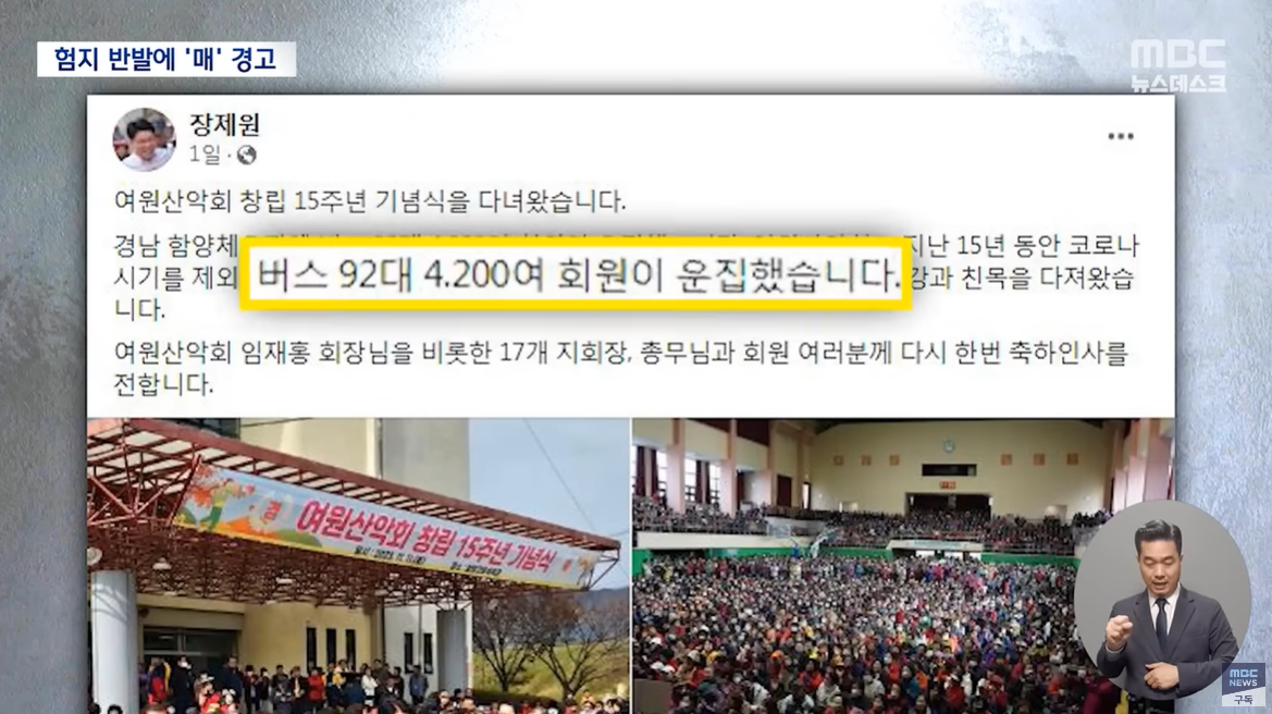 산악회 명예회장을 맡아온 장 의원은 SNS에 "버스 92대, 4천200여 회원이 운집했다"고 전했습니다.