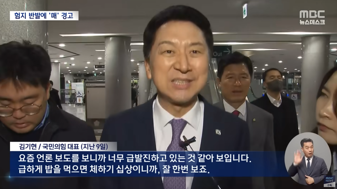 "요즘 언론 보도를 보니까 너무 급발진하고 있는 것 같아 보입니다. 급하게 밥을 먹으면 체하기 십상이니까, 잘 한번 보죠."