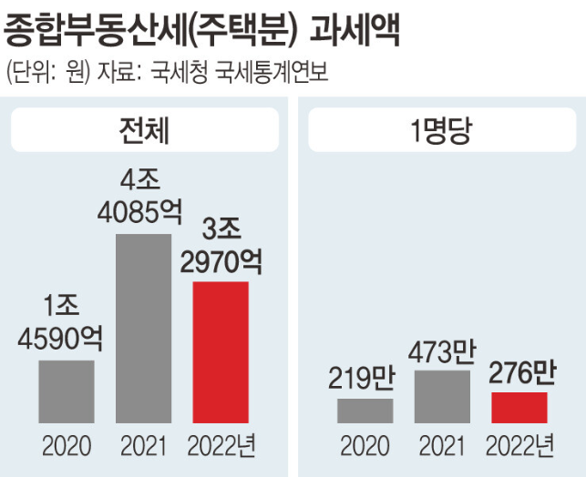 기재부 핵심 관계자는 “보유세 부담은 세법 개정과 현실화율(공시가격 산출때 시세에 적용하는 할인율) 하향 조처, 공시가격 역대 최대폭 하락으로 2020년 이전 수준으로 이미 줄어들긴 했다”며 “보유세 중 종부세가 일부 다주택자를 중심으로 2020년 수준보다 높은 경우가 있어 공시가율 60% 유지를 결정한 것”이라고 말했다.