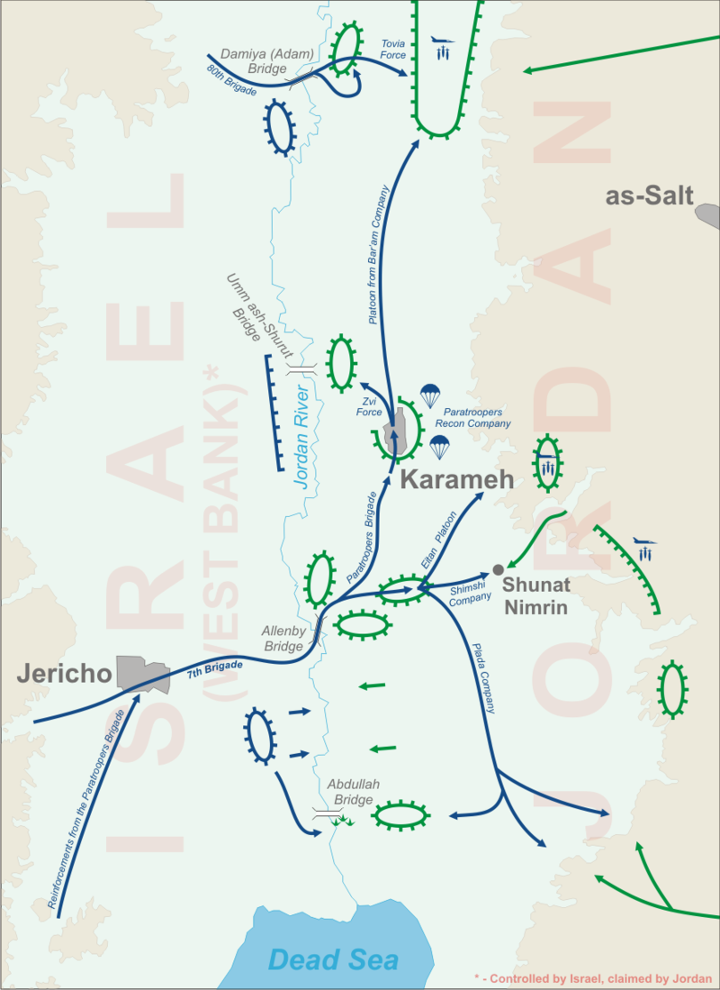 탱크와 헬리콥터 지원을 받은 이스라엘 1만 보병이 요르단 알렌비 (Allenby) 다리를 건너왔다. 이스라엘군의 목표물은 카라메였다.