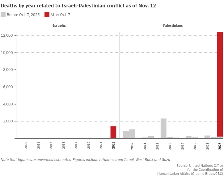 팔레스타인-이스라엘 전쟁의 역사 속, 양 측 사망자 비교