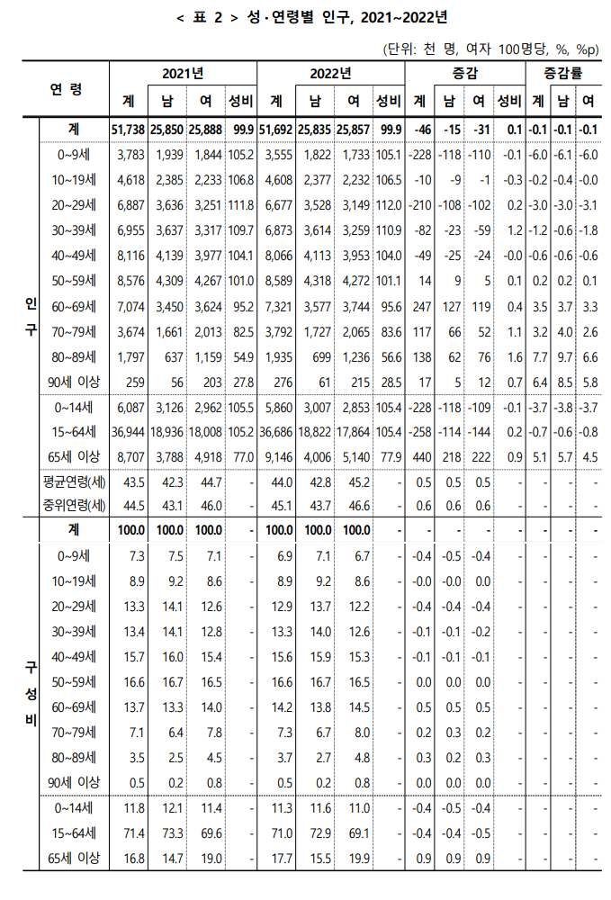 연령대로 보면 남성은 50-54세에 2,283,657명, 여성은 50-54세에 2,249,766명으로 가장 많습니다.