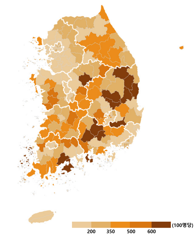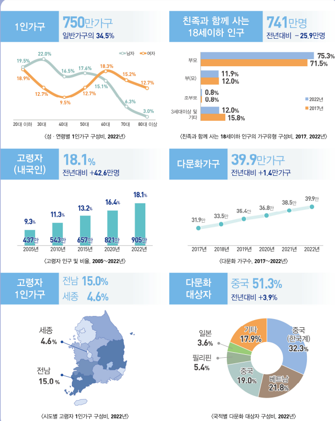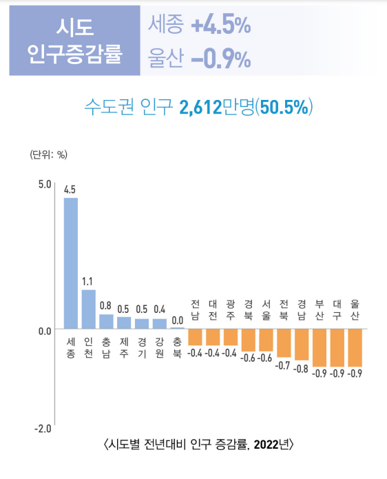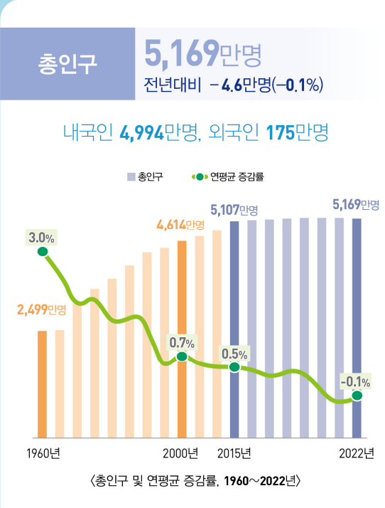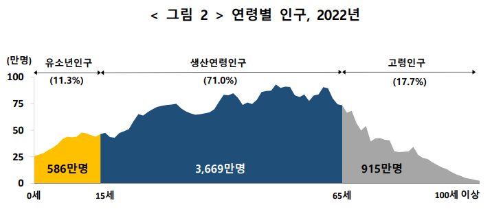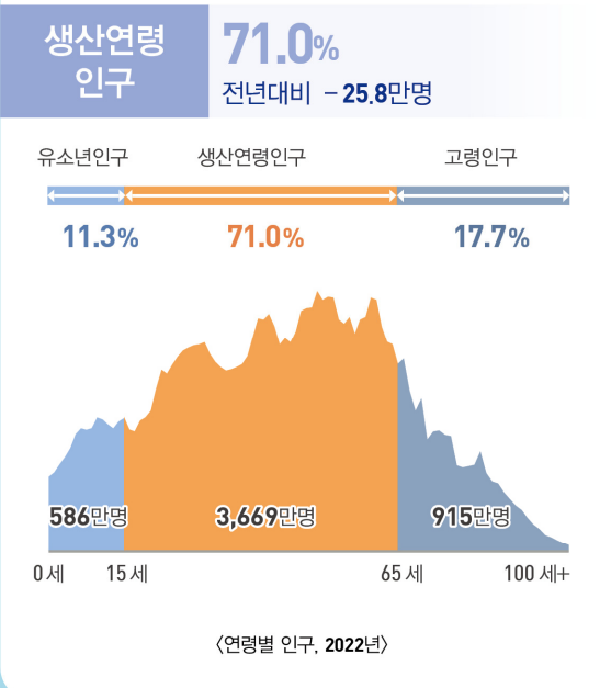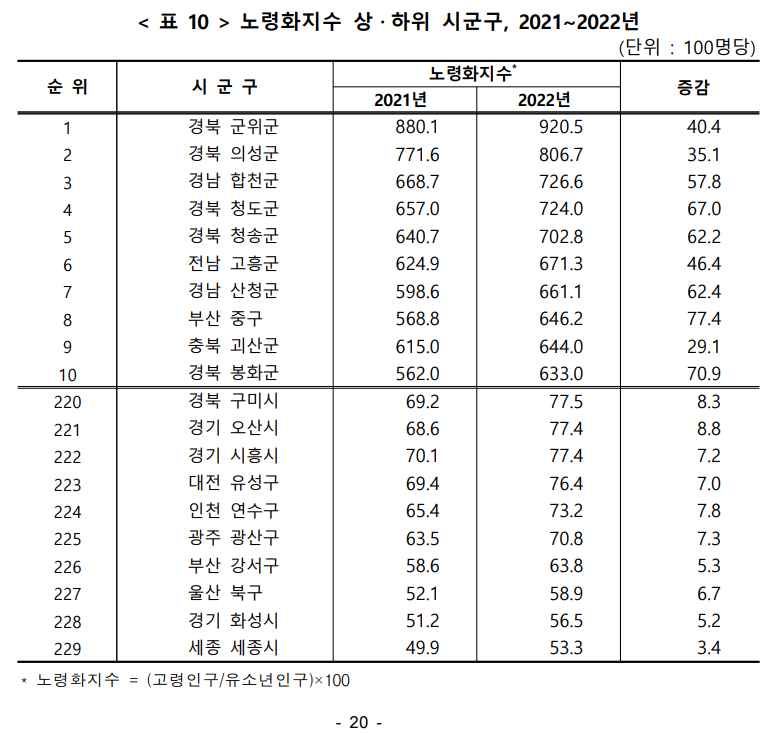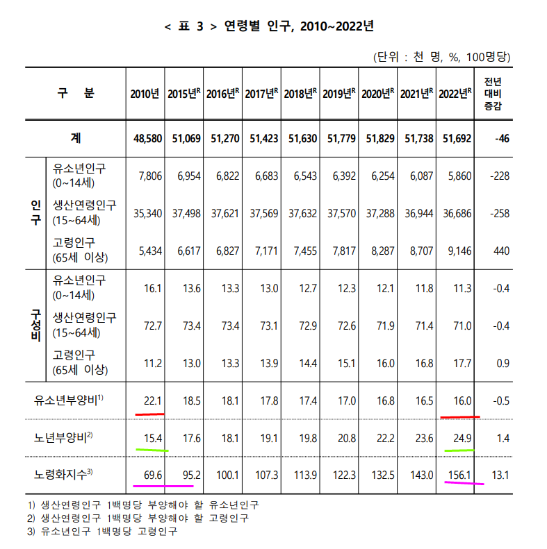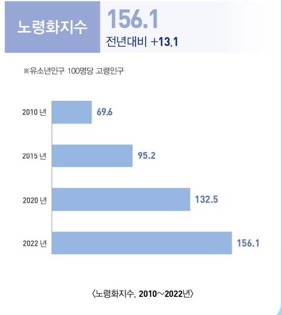 노령화 지수 (유소년 인구 100명당 고령 인구 65세. 2010년 69.6 %에서 2022년 156.1%로 급증)