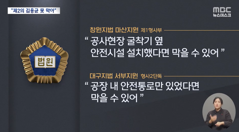 법원은 작년 5월 경남 창원의 공사현장 굴착기 옆에 안전시설만 있었다면, 작년 9월 대구의 철강제품 공장에 안전통로만 있었다면 노동자의 죽음을 막을 수 있었다고 지적했습니다.
