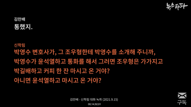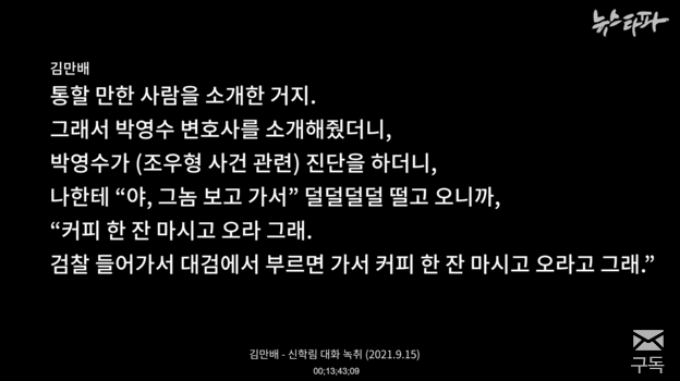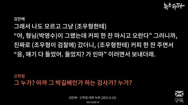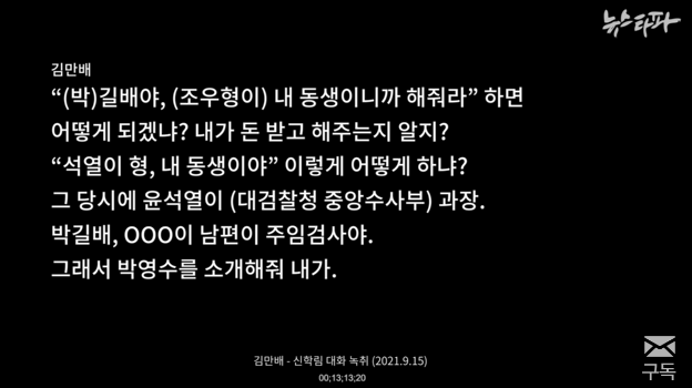 2. 뉴스타파가 신학림-김만배 녹취를 보도하는 것은, 특종도 아니었고, 이전부터 나온 내용들을 담고 있었다. 윤석열이 부산저축은행 조우형을 봐주기 수사했다는 보도는 그 이전에도 남욱 변호사 조사과정에서 이미 있었음. 신학림-김만배 녹취록에는, 김만배가 직접 자기가 박영수에게 연락해, 조우형 봐주기를 시도했다는 김만배의 목소리가 직접 담겨져 있음. 이것이 신학림-김만배 녹취록의 <뉴스타파> 보도임.