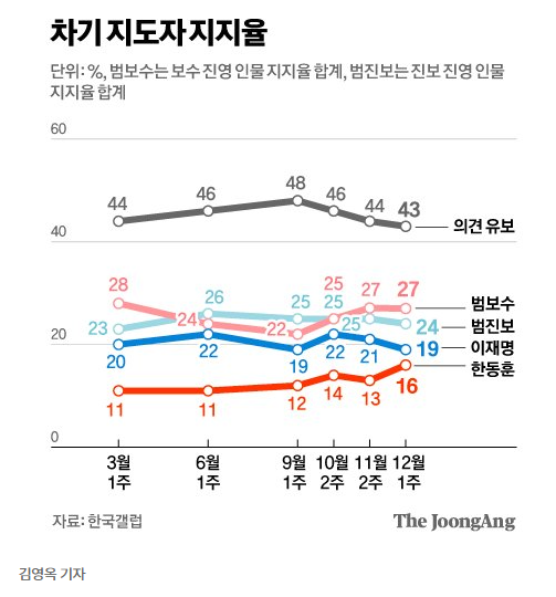 하지만 범보수 진영과 범진보 진영 전체 합계 지지율로 따지면 큰 변화가 없는 상황이다.