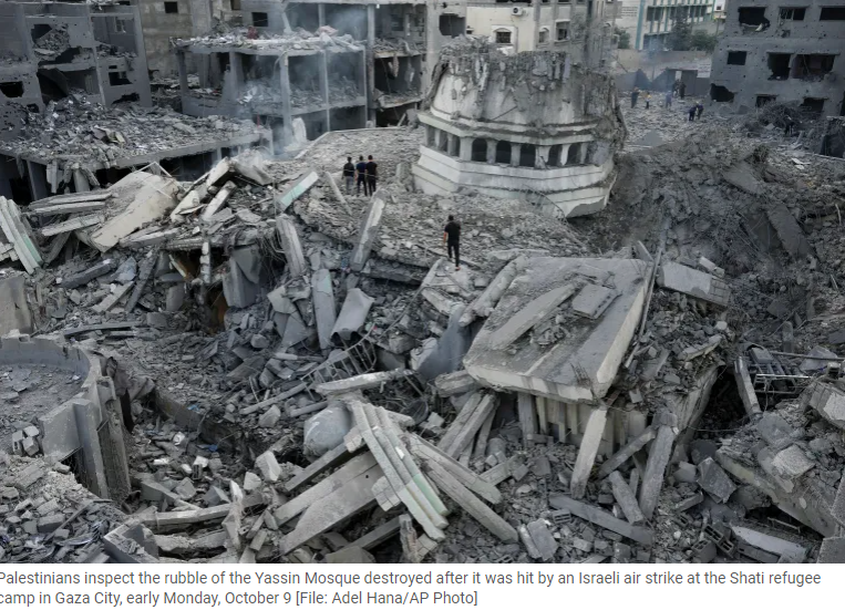 Palestinians inspect the rubble of the Yassin Mosque destroyed after it was hit by an Israeli air strike at the Shati refugee camp in Gaza City, early Monday, October 9