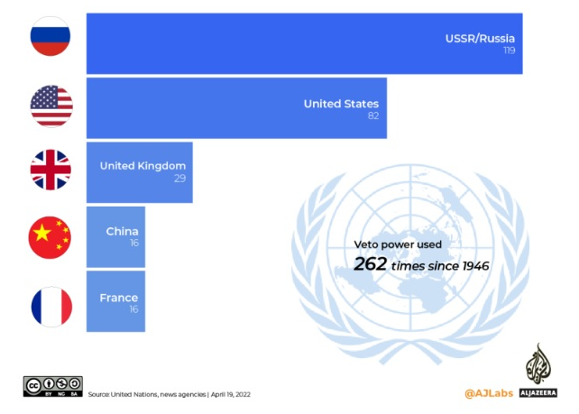 현재 유엔안보리 결의안 통과 조건. (안보리 15개 이사국 중, 9개 이상 찬성과 5개 상임 이사국 (미국, 영국, 프랑스, 러시아, 중국) 중 어느 한 곳도 거부권을 행사하지 않아야 함)