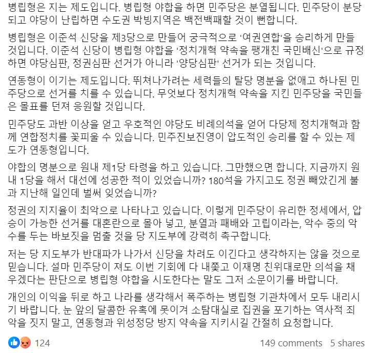 저는 당 지도부가 반대파가 나가서 신당을 차려도 이긴다고 생각하지는 않을 것으로 믿습니다. 설마 민주당이 져도 이번 기회에 다 내쫓고 이재명 친위대로만 의석을 채우겠다는 판단으로 병립형 야합을 시도한다는 말도 그저 소문이기를 바랍니다.