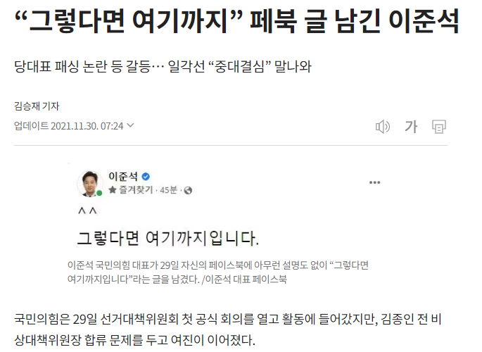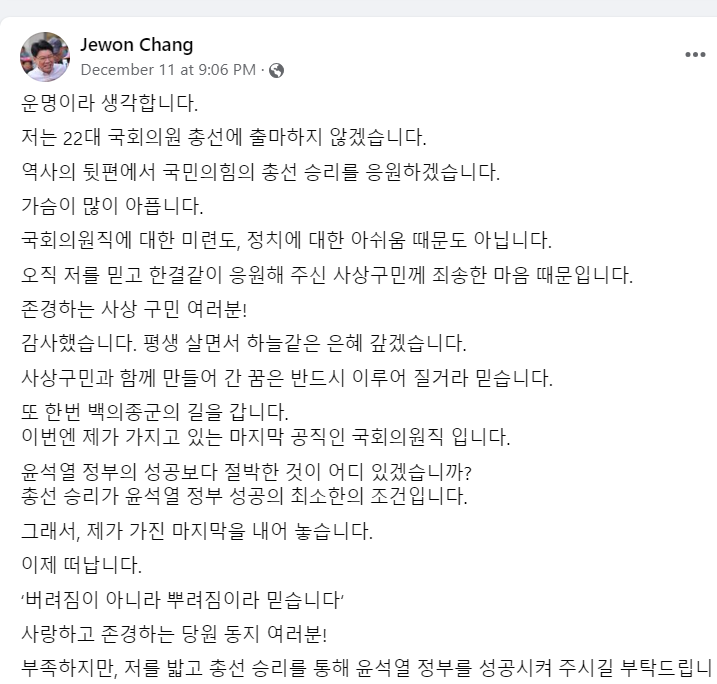 | 국민의힘 장제원 페이스북, 현재 '칠흙같은 어둠'을 견디며, '더 좋은 것'을 기다리겠다. 윤석열, 이준석 요구사항 수용 가능성. (0) | 2023.12.12 |