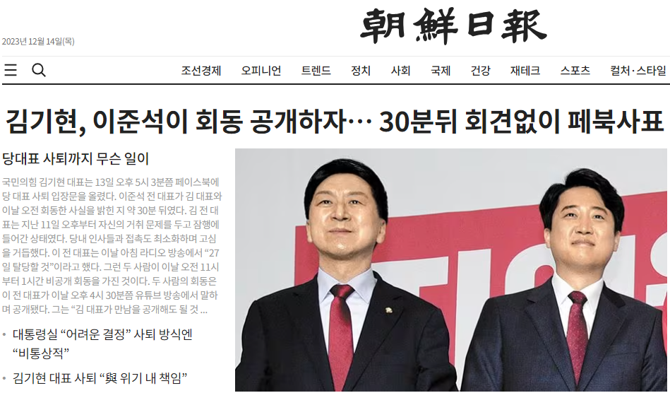 2023년, 12월 13일 김기현 국힘 대표 사퇴. 이준석과 회동.