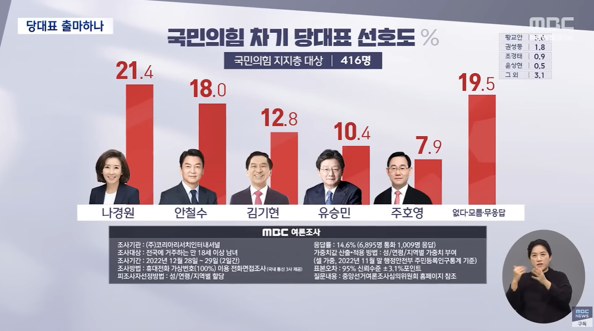 국민의힘 지지층 내부 여론조사. 당대표 선호도, 1위 나경원 21.4%, 안철수 18%, 김기현 12.8%, 유승민 10.4%, 주호영 7.9% 였다.