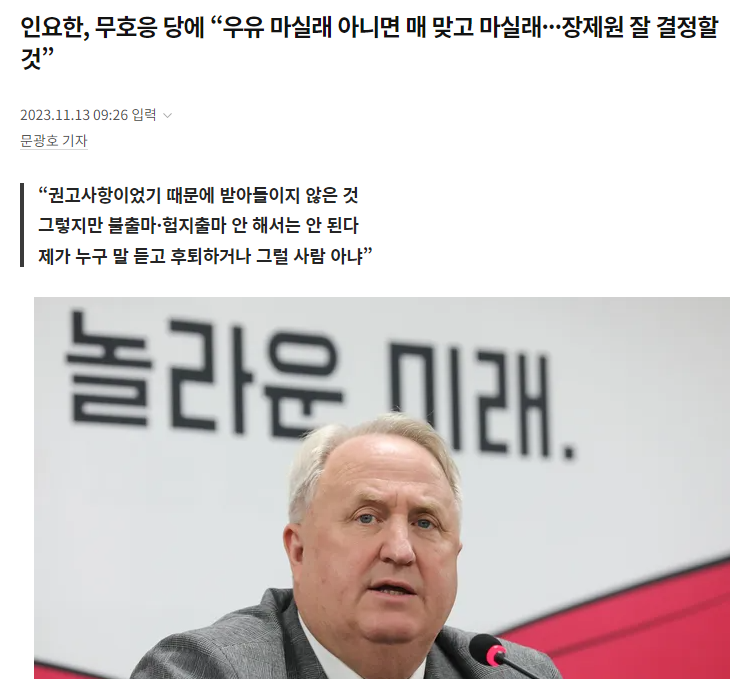 2013년 11월 13일. 국민의힘 혁신위, 인요한, '우유 마샐래 아니면 매 맞고 마실래', 윤핵관 장제원 권성동에게 경고장