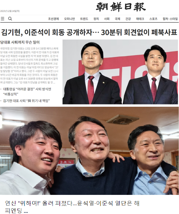 | 조선일보. 국민의힘 서울 49석 중, 우세 6곳 보도 이유 : '영남 자민련' 우려. 김기현,장제원,권성동 아웃, 김건희 유배, 이준석 포용 (0) | 2023.12.13 |