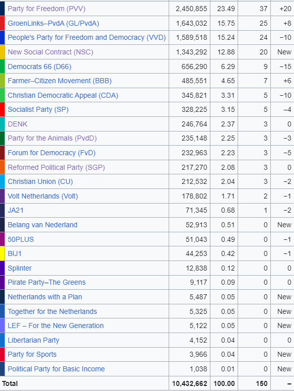 극우파 자유당 (PVV)이 전체 150석 중, 37석을 차지했다. 자유당 대표 헤르트 빌더스는 '연정'을 꾸릴 자격을 얻었으나, 연정 상대인 두 정당, '자유와 민주를 위한 국민당 VVD (24석)'과 신사회계약 (NSC, 20석: 기독교 민주주의) 두 정당이 자유당과의 연정에 참여하지 않으려고 한다.