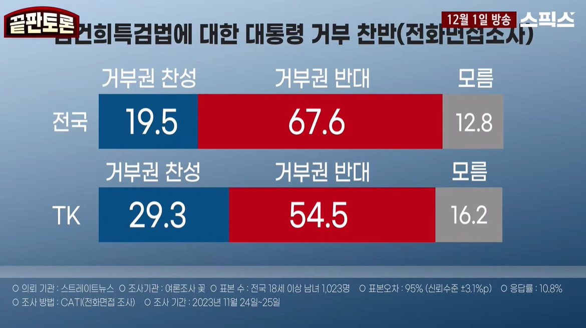 한국정치/국힘_한나라당_새누리당_자유한국당 대구-경북 여론조사. 윤석열 대통령이 김건희특검법에 대한 거부권을 행사해야 한다. 대구 경북 찬성 29.3% , 반대 54.5% (전화 면접 조사) by 원시 2023. 12. 24. 대구 경북 여론조사 윤석열 대통령이 김건희특검법에 대한 거부권을 행사해야 한다. 대구 경북 찬성 29.3% , 반대 54.5% 전국 찬성 19.5%, 거부권 반대 67.6% 공유하기 게시글 관리 한국정치 노트 Notes on the Politics of Korea 저작자표시 비영리 변경금지 (새창열림) '한국정치 > 국힘_한나라당_새누리당_자유한국당' 카테고리의 다른 글 윤석열 2024. 내각제였다면 '조기 총선' 상황임. 자진 사퇴하지 않을 것이면, 정의당,민주당 등 '거국 내각 수립'하고, 윤석열은 '외교'만 맡고 5년 끝내야 함. (1) 2023.12.25 보수 언론들 위기의식 심각, 윤석열을 버리는가, 아니면 경고인가? 조선일보 사설, 윤석열 본인은 뭘 희생할 것인가? (0) 2023.12.24 요새 달라진 [동아일보] 윤석열 공천 개입하지 말라. 비대위는 정당 정치의 종말. (0) 2023.12.24 한국일보 사설-한동훈 비대위, 맹종하지 않겠단 약속 행동으로 보여야 (2) 2023.12.22 중앙일보 최민우 "한동훈식 6.29 선언은 가능한가" 문제점. 629에 상응하는 정치선언이 무엇인가, 조기 대통령 선거, 아니면 '거국 중립내각' (2) 2023.12.22 정치인들의 '아무렇게나 야구, 축구 비유' - 한동훈 '수비'인데 '공격'을 말함 . 아직도 문재인 정부에서 탄압받는 '검사'로 착각 (1) 2023.12.22 1988.05.25. 조선일보 광고. 평민당 김대중 총재에게 보내는 공개장 -반공애국단체총연합회. 2023년 815 경축사,윤석열 발언과 유사 (1) 2023.12.20 관련글 보수 언론들 위기의식 심각, 윤석열을 버리는가, 아니면 경고인가? 조선일보 사설, 윤석열 본인은 뭘 희생할 것인가? 요새 달라진 [동아일보] 윤석열 공천 개입하지 말라. 비대위는 정당 정치의 종말. 한국일보 사설-한동훈 비대위, 맹종하지 않겠단 약속 행동으로 보여야 중앙일보 최민우 "한동훈식 6.29 선언은 가능한가" 문제점. 629에 상응하는 정치선언이 무엇인가, 조기 대통령 선거, 아니면 '거국 중립내각'