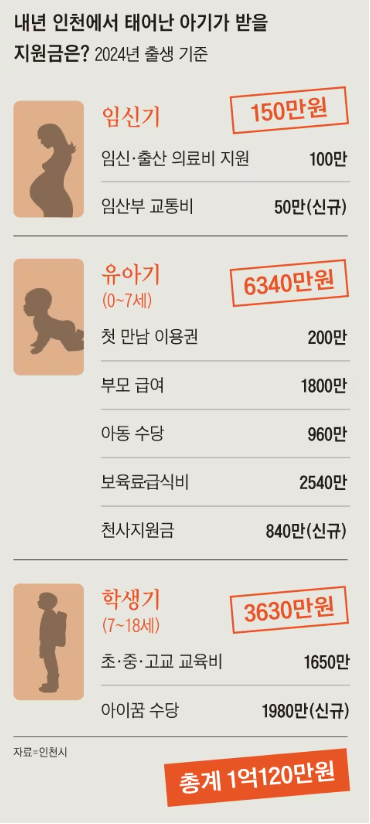 인천시가 내년부터 인천에서 태어나는 모든 아이에게 만 18세가 될 때까지 총 1억여 원을 지급하는 출산 장려책을 발표했다. 부모 급여, 아동 수당, 교육비, 보육료, 급식비 등 현재 중앙 정부와 인천시가 주는 지원금을 다 합하면 1인당 7200만원 수준인데 여기에 2800만원씩 특별 지원금을 더 주겠다는 것이다.
