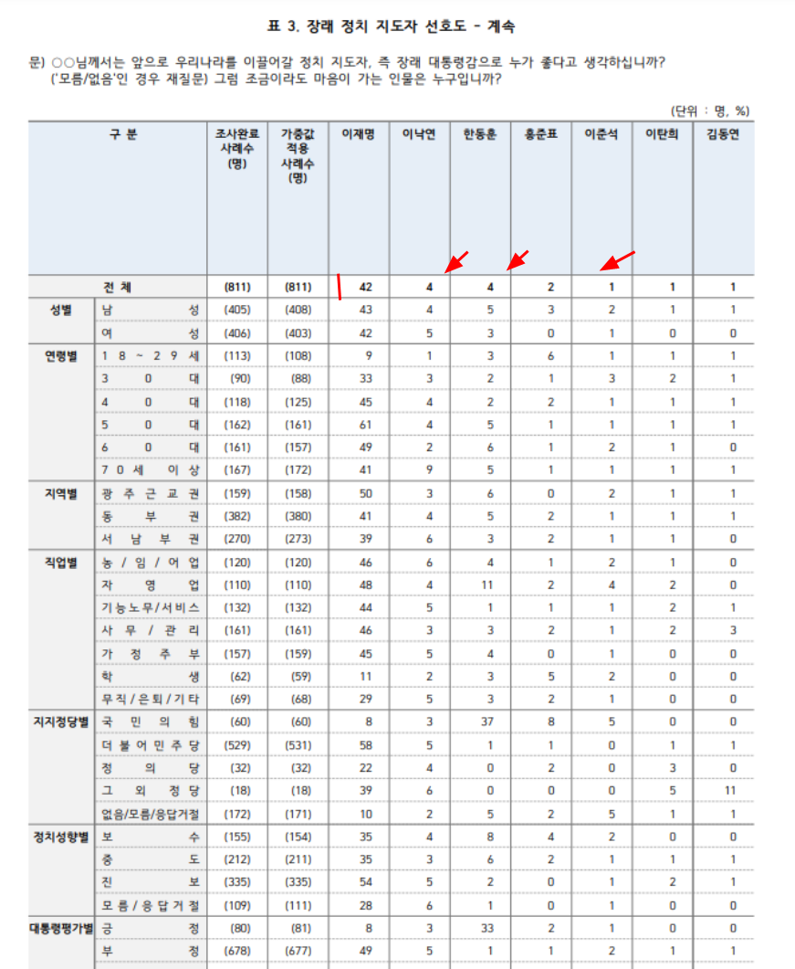 3.차기 대통령감. 이재명 42, 이낙연 4, 한동훈 4, 홍준표 2, 이준석 1, 이탄희 1